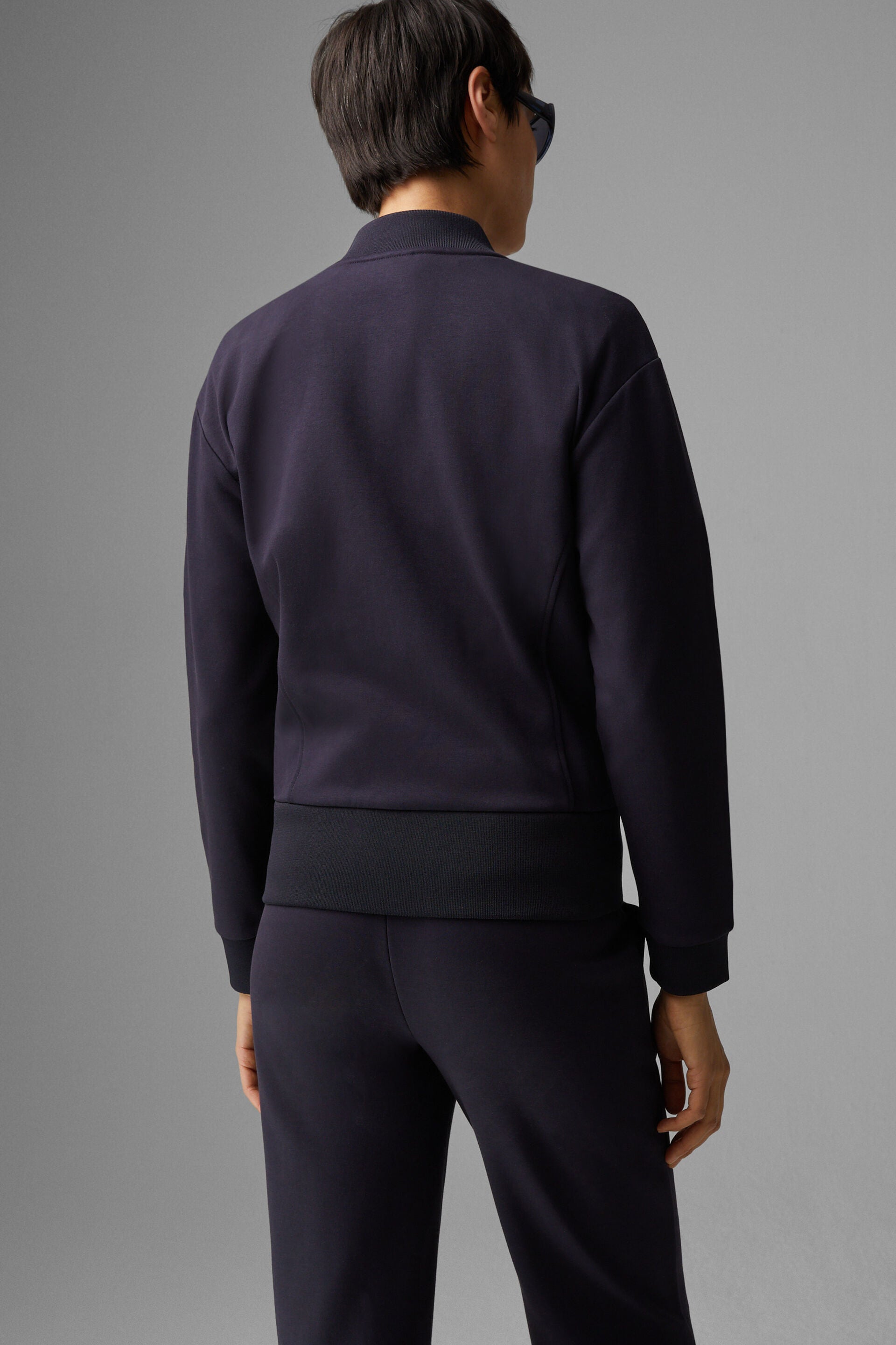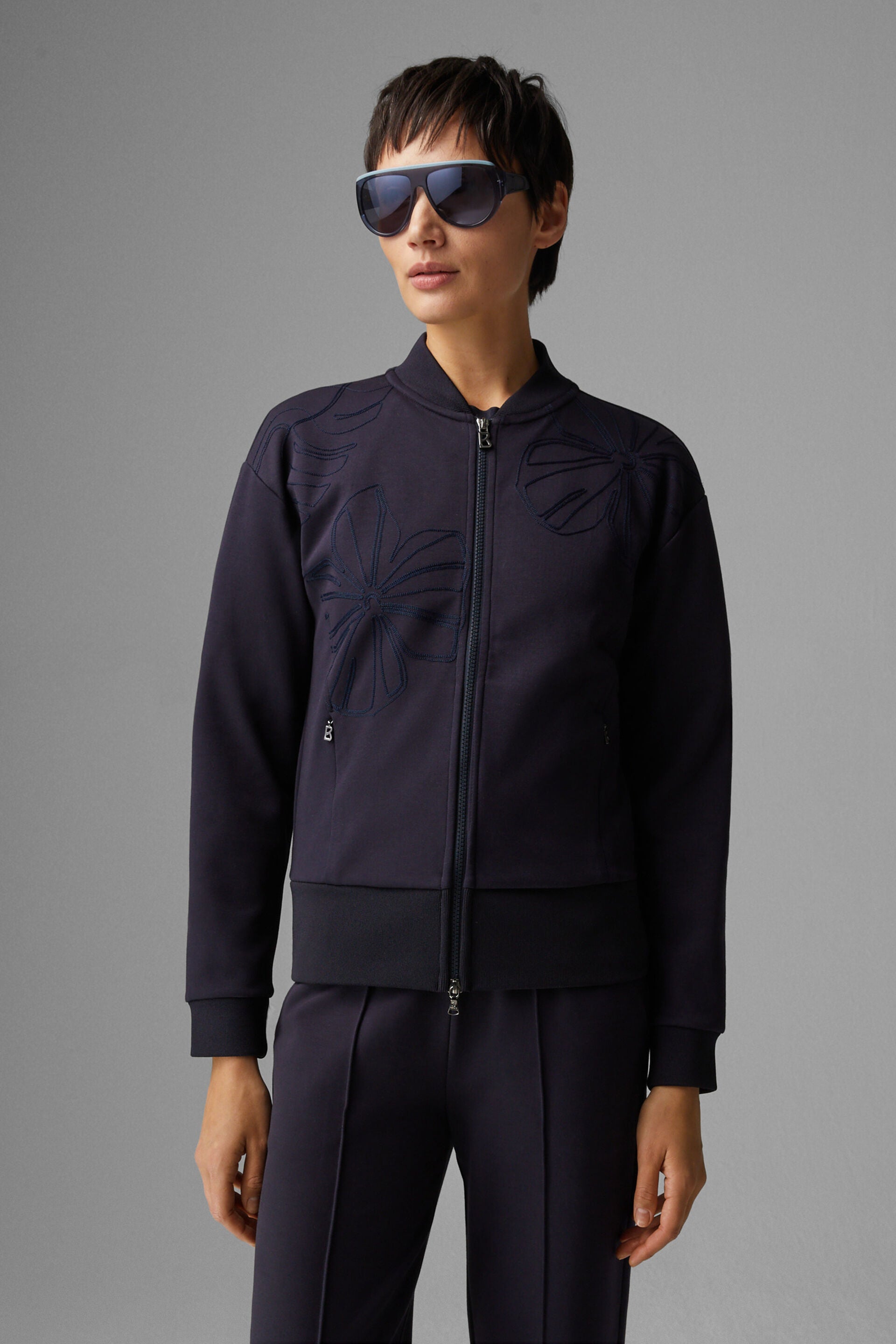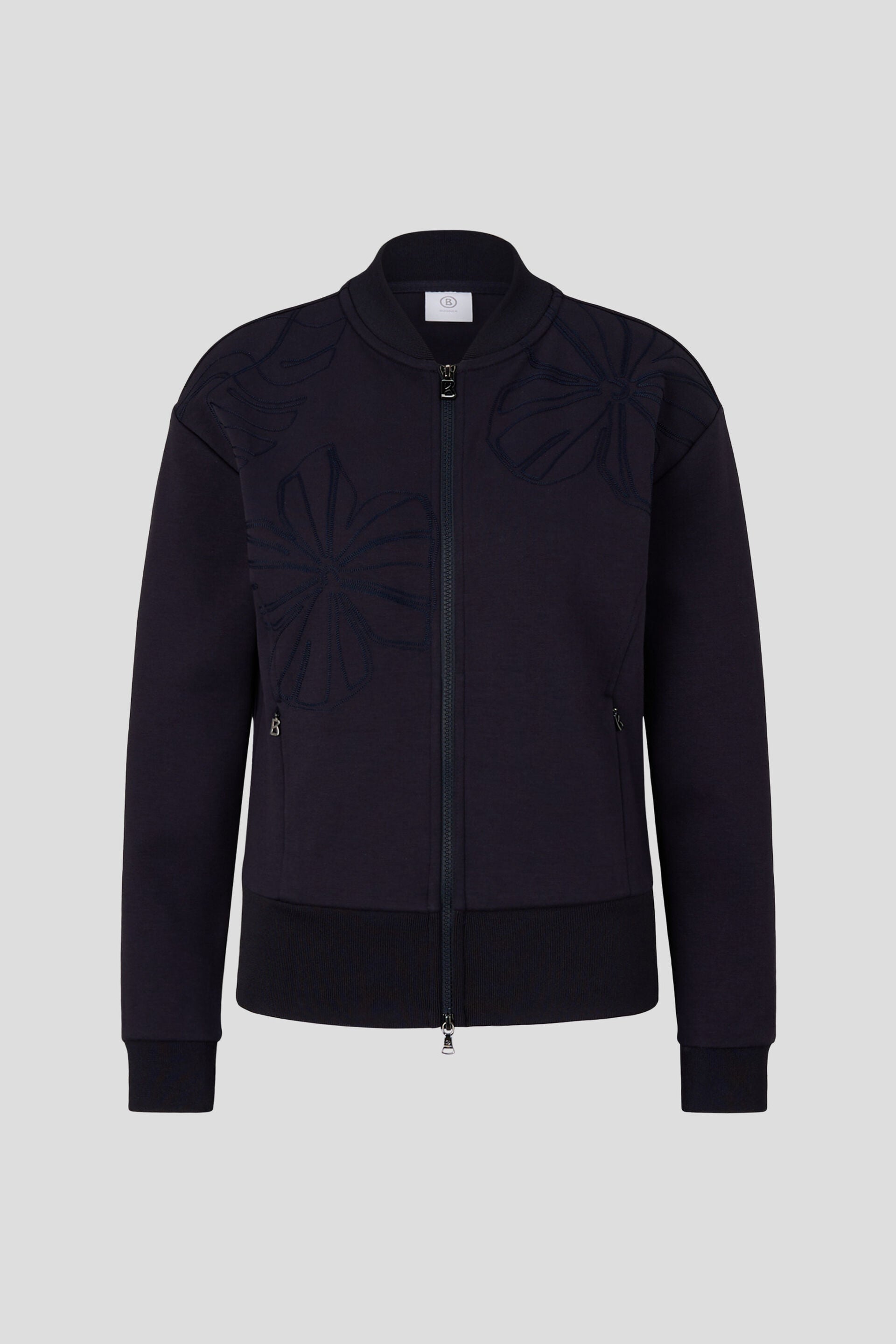 In a technical cotton blend with fashionable embroidery on the front, the sweatshirt jacket impresses both as a stand-alone all-rounder. The two-way zip and invisible in-seam zip pockets on the sides add functional flair, while the hems and stand-up collar in ribbed knit add urban accents.