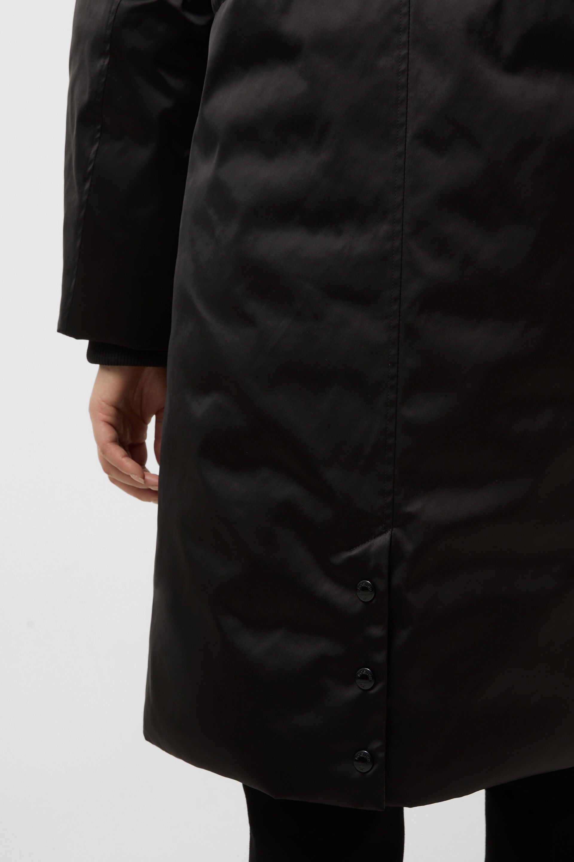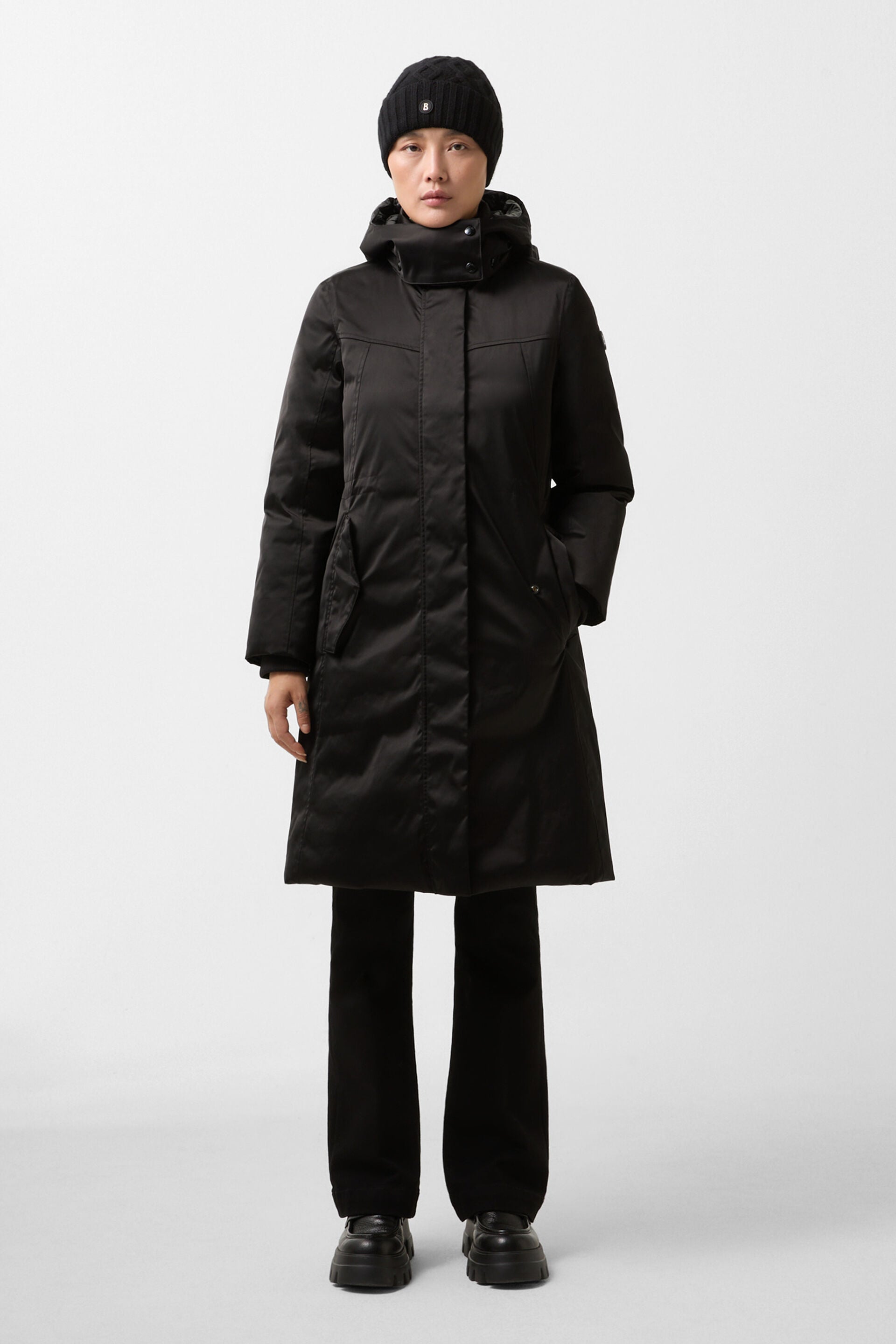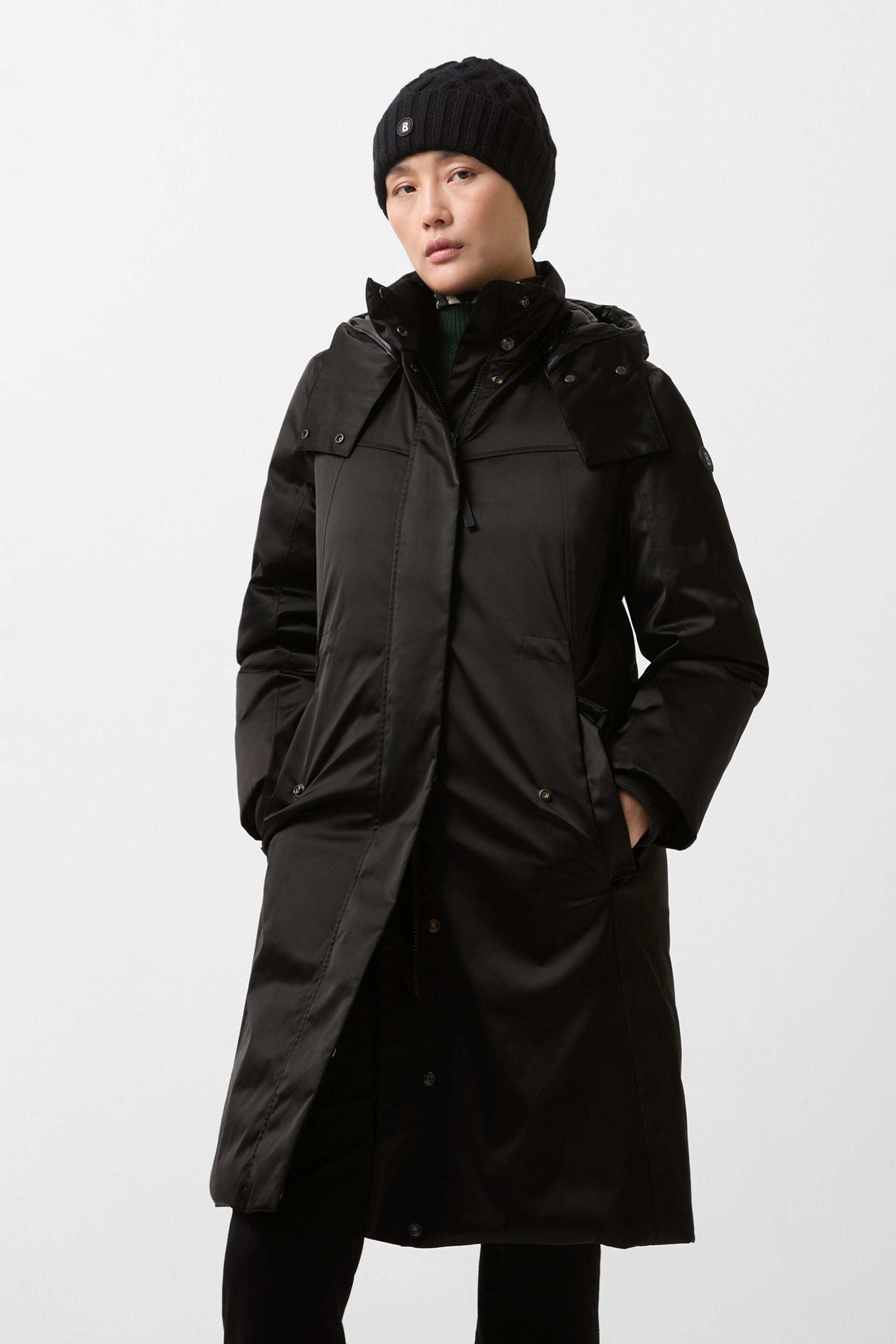 This down coat is characterized by satin fabric in two-way stretch and padding made from pure duck down. The style is emphasized by the detachable hood and side flap pockets, while the drawstring waist and ribbed cuffs round off this comfortable piece.