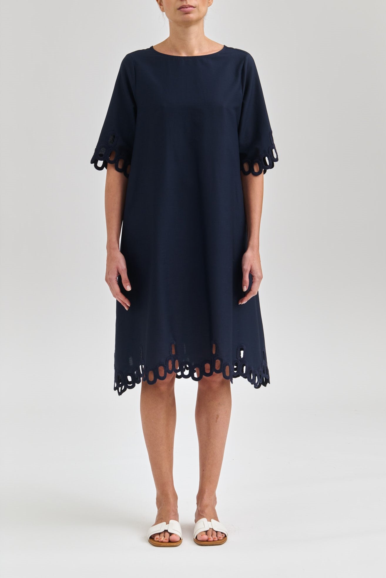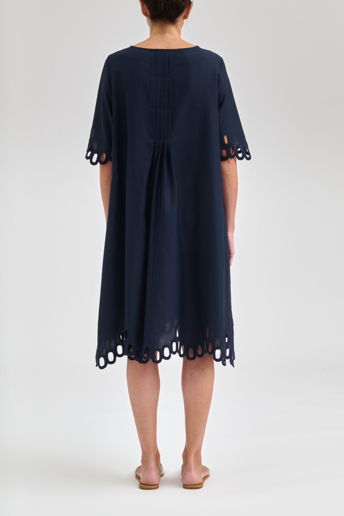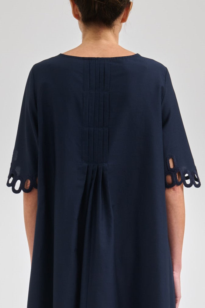 A-line shaped cotton dress with pleated back and handmade guipure lace trim on sleeves and hem in navy.